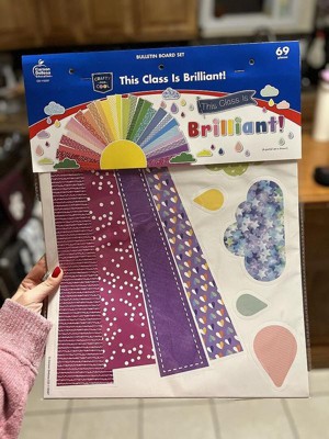 Carson Dellosa Education Crafty and Cool This Class Is Brilliant! Bulletin Board Set, 69 Pieces | Inspire your students year-round with encouraging classroom decorations using Carson Dellosa's Crafty and Cool Motivational Bulletin Board Set! The 69-piece bulletin board set includes a "This Class Is Brilliant!" header assembled from 11 pieces (largest: 19.15", smallest: 2.02" x 5.27"), a 7-piece sun (assembled size: 44.61" x 25.37"), 9 clouds (largest: 6.5" x 3.97", smallest: 4" x 2.16"), 6 patches of grass (largest: 8.81" x 3.49", smallest: 5.2" x 2.16"), and 36 raindrops (largest: 2.53" x 3.37", smallest: 1.34" x 1.75"). Use the raindrop accents to display student names, or showcase student work underneath the inspirational banner throughout the schoolyear. Create vibrant wall decor, or decorate your bulletin board, white board, and cork board displays with ease.