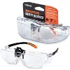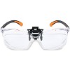 These Magnifying Safety Glasses from CARSON give the dual benefit of protective eyewear with the included clip-on, flip up magnifying lenses to help aid with any low vision needs. The distortion-free clip-on, flip up magnifying lenses contain a 1.5x power magnification which is equivalent to +2.5 diopters. The safety glasses contain scratch resistant polycarbonate lenses and cushioned rubber temple pads for maximum user comfort. The clear lens design also provide UV A/B/C protection along with protective side shields. The magnifying safety glasses are rated for eye protection against low to moderate impact hazards but are not unbreakable. They are not recommended for any high impact hazards such as but not limited to shooting, racket sports, paintball or any other similar activities. Pitted or scratched lenses reduce vision and seriously reduce protection and should be replaced immediately. The safety glasses do not provide unlimited protection. They must be worn for the whole duration of exposure to hazards. Leave the work area if any irritation occurs or if the glasses become damaged or cracked. These safety glasses meet the ANSI/ISEA Z87.1-2015 personal eye protection standard for impact resistance. These glasses are not rated to protect from hazards including, but not limited to chemical, heat, welding, dust, light (IR/UV/Laser/etc.) and splash hazards. Additional protective eyewear such as face shields and helmets should be worn to provide additional protection depending on the application and the manufacturer's specifications. The magnifying safety glasses come included with a protective PVC storage pouch with a magnetic enclosure system. This protective eyewear is great for multiple hobbies, crafts, tasks and other low vision tasks. They are backed by CARSON's limited lifetime warranty.