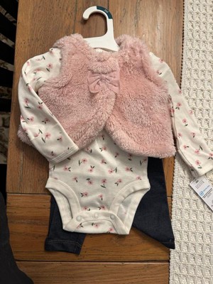 Baby is cozy and stylish in this layered look by Carter's Just One You. This 3-piece set for baby has everything you need for the changing season - an adorable faux shearling vest layered over a long sleeve bodysuit and matching pants. Your tiny trendsetter is ready for park playdates, birthday parties, and everything in between. Giving style and convenience, the bodysuit has overlap shoulders for easy dressings and strong snaps at the legs!