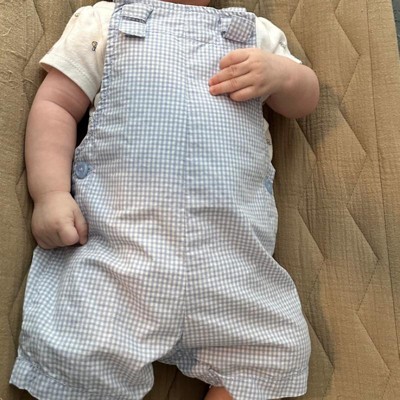 • Coordinating shortalls: adjustable shoulder straps, buttons on side, snaps at legs, Blue allover gingham print