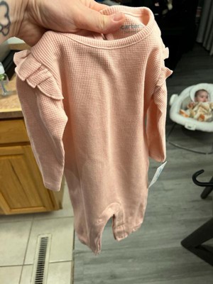 [This review was collected as part of a promotion.] I absolutely love this pink onesie! The material is soft and cozy, with a nice waffle texture that feels gentle on baby’s skin. The ruffle sleeves add the cutest touch! The snaps on the legs make diaper changes easy, and fits true to size! Highly recommend!