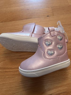Cowgirl boot meets sneaker! Early steps are gonna be safe and stylish with the smooth pink PU leather and shimmering iridescent hearts. Carter’s quality and thoughtful design- stars are twinkling on the sole and providing great traction. Awesome baby shoe!
