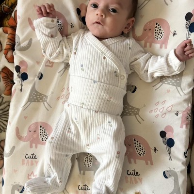 I bought this item last year for my little girl's first outfit in the hospital. I put it on her a few hours after my C-Section after some skin to skin in just a diaper. The wrap style top still allowed me to easily unbutton it for skin to skin time with her during feedings, but still have her cozy and cute for visitors and pictures. The print is adorable and girly but subtle and the material is soft agai nst brand new baby skin! I would definitely recommend this outfit!