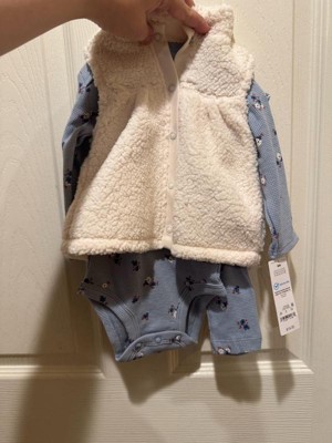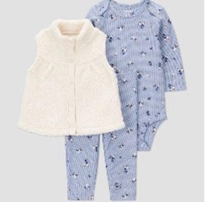 This Carter's Just One You 3-piece pants set for baby girl is an absolute must-have! The set includes a faux shearling vest, a long sleeve bodysuit, and coordinating pants. The cuteness lies in the details: her plush vest is ultra-cozy and her bodysuit and pants feature an adorable floral print. The long-sleeve bodysuit has convenient overlap shoulders and snaps at the legs making dressing and changing easy! Your little one will be cute and comfy in this adorable set. Perfect for any occasion, it's a great addition to baby girl’s wardrobe season.
