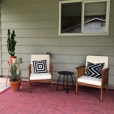 These are really nice looking chairs. I was looking for something small for my patio and wanted the teal cushions but it was sold out. The cushions are hard and not comfortable, so I'll end up buying a other cushions. Hope these stand up to the elements. They're outdoor chairs but instructions say don't let them get exposed to constant water/rain?