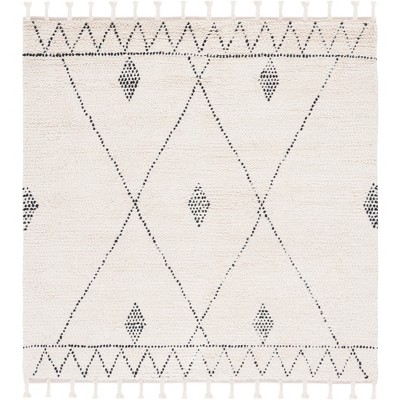 Enhance your living space with this beautifully crafted 6' X 6' square area rug, a perfect fusion of traditional Bohemian style and modern sophistication. The striking ivory and black color palette is sure to make a bold statement in any room, while the intricate geometric pattern adds depth and texture to your floor.