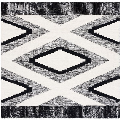 The striking design features a bold geometric pattern in contrasting ivory and black colors that draw the eye and add a dramatic flair to your living space. The square shape of this superb rug amplifies its unique aesthetic, fitting seamlessly into both modern and traditional decors.