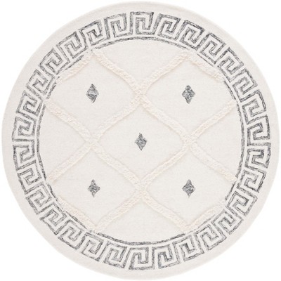The rug's round shape invites a sense of harmony and balance into your living space, making it ideal for placement in open areas, beneath circular tables, or as a captivating focal point in any room. Its motif, visible in the image, features a delicate grey diamond pattern on an ivory background, lending a touch of subtle intricacy to its design.