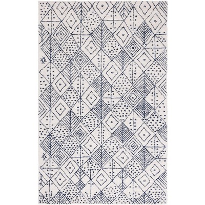 The eye-catching pattern, inspired by the gentle interplay of ivory and blue hues, showcases a series of diamonds and geometric motifs that blend harmoniously to fit both contemporary and traditional decors. Whether anchoring your living room furniture or nestled under a dining table, this rug's small rectangular shape is versatile and perfectly sized for intimate spaces.