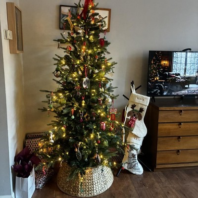 Casafield’s handcrafted Christmas tree collar woven from sustainable water hyacinth with a sturdy metal frame, offers durability and eco-friendliness. Available in multiple sizes, this collar replaces traditional tree skirts, protecting children and pets from the tree base. Each piece is handcrafted, expect slight variations in color and measurements.It features easy assembly with no hardware, efficient cord management, and compact storage, ensuring it’s a perfect choice for many seasons.