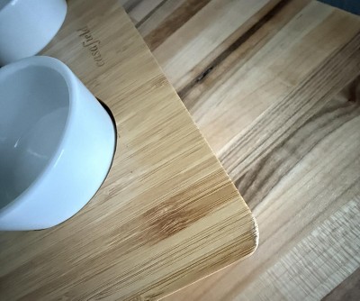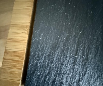 This charcuterie board has a slate board that can be written on and a drawer with all the serving pieces needed. It is pretty heavy for a small board due to slate. Two corners of the bamboo board have a defect. Corners are chipped.