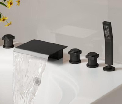 [This review was collected as part of a promotion.] I was immediately impressed with the quality and durability of this faucet set; it feels very high-end. The pieces are heavy, made from solid brass with a beautiful matte black finish that completely modernized my tub. In terms of design, it's sleek and minimalist. The water flow from the main spout is strong and fills the tub quickly, while the handheld sprayer is perfect for rinsing. Installation was surprisingly straightforward for a 5-hole setup, and the instructions were clear. So far, the finish has been easy to clean and seems resistant to fingerprints and water spots, so maintenance is low. Sum up your review in one line A high-quality, durable faucet with a stunning modern design.