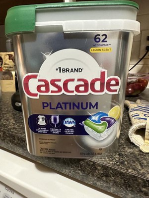 New and Improved Cascade Platinum ActionPacs dishwasher detergent scrubs away dried on food with no pre-washing required. That's because the pod dissolves fast to start cleaning right away, releasing the soaking power of Dawn dishwashing liquid, while food-seeking enzymes latch on and break down food into particles so small they can flow right down the drain. Cascade Platinum dishwashing detergent is formulated to remove visible and invisible residue for gleaming glassware and dazzling dishes. Save up to 20 gallons of water per dishwasher load when you skip the pre-wash and run your dishwasher with Cascade Platinum