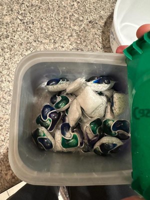 Personally, I love these tablets. Makes washing dishes easy. However, I went to pick it up at my local Target and received this. It was greasy all over the outside, so I meticulously picked out each tablet to figure out the issue. A few of them exploded on the bottom leaving this aftermath. I wish the workers could see that there was an issue when the packaging on the outside was greasy and when it covered my other items inside the bag.