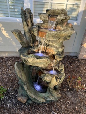 [This review was collected as part of a promotion.] This 39” tall outdoor Alpine garden tower fountain added extra charm to my front yard. It Catches the eye of everyone walking by. This fountain looks very natural with beautiful green shaded soft rocky exterior. The sound of water is so relaxing and soothing. I am planning to add few more flowering plants and rocks around the fountain to make it look more highlighted. I just love how water flows from top step to the last step and the branch accent on the side of the statue gave the realistic natural feel . Very easy to install, it just took 20 min to get it installed. we had to go purchase an outdoor power strip that had two outlets, as the fountain lights had one plug and the pump has another. This fountain has inbuilt LED white lights. This is very attractive piece. Got so many compliments! This water fountain includes all necessary parts and a pump, to begin creating an outdoor oasis. We used distilled water as instructed. Behind the statue there is a square shaped opening with slide closure where we put water and the cords run out of the unit. There is a tube that goes in to the water, once we switch on the unit the tube is going to pull and carry water to the top of the fountain and functions as designed. All together we had put 4 gallons of distilled water in it. Fountain runs very smooth with great flow. It is of excellent quality and not too heavy to handle. This standing fountain measures 21 in L x 15 in W x 39 in H. I would definitely recommend this to my friends and family.