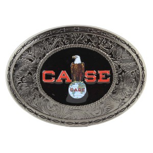 Made by SpecCast, this is aCase Old Abe Eagle Western Style Buckle. It features a Case Old Abe Eagle on the globe in color on a black background. It sports a western style design with a barbed wire border. This buckle has a hook style closure and is made of solid metal. It will accommodate up to a 1.5" wide belt. Recommended for ages 14+. Measures approximately 3.875"W x 2.75"H.
