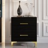Discover the perfect storage solution for your bedroom with our exquisite nightstand, designed to meet your needs without compromising on style and functionality. Crafted from solid and engineered wood, this nightstand guarantees durability and longevity, ensuring it withstands the test of time. Supported by four sturdy golden metal legs, it adds both durability and stability to the nightstand. The modern and sleek design is further enhanced by the addition of classic gold drawer handles, providing the perfect finishing touch and infusing a luxurious vibe into your bedroom. The spacious top surface of this nightstand offers a convenient spot to place your bedside essentials, creating a practical and stylish display area. Whether it's a table lamp, alarm clock, or other items you prefer to keep within reach, this nightstand provides the perfect space to keep them handy. In addition to its stylish design, this nightstand features two drawers, providing ample storage space for your favorite belongings. Keep everything neatly organized and easily accessible within the drawers. The drawers are designed with pre-assembly metal slides, allowing for effortless opening and closing, so you can access your items quickly and efficiently, saving you valuable time and effort. Easy to assemble as it arrives conveniently packaged in one box, accompanied by clear instructions and a thoughtfully sorted hardware pack. To match your home decor, this exquisite nightstand is available in classic Black and White color options. Choose the color that best complements your existing decor and personal style, effortlessly integrating it into your bedroom.