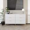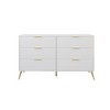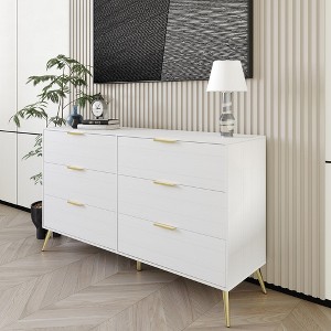 This exquisite dresser boasts six wooden drawers, each featuring pre-installed metal slides for effortless operation. Supported by four tapering legs and a central stabilizer leg, all meticulously crafted from solid metal with luxurious gold finishes, it ensures remarkable stability and enduring strength. Crafted from a high-quality combination of solid wood and engineered wood, this dresser offers the perfect blend of sturdiness and resistance. The generously spacious drawers provide ample storage for a variety of items, making it an ideal solution for neatly. You have the freedom to choose from three exquisite color options: black, white, silver, and light grey, allowing you to seamlessly match your surroundings. The delicately polished metal gold handles and legs add a touch of refinement and elegance to the overall design. The simple design reduces maintenance and allows for easy cleaning. Assembling the dresser is a breeze, thanks to the included hardware kit for organization and detailed assembly instructions. The entire shipment is thoughtfully packed in a single box, simplifying the delivery process.