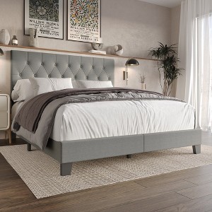 For those who seek simplicity and modernity, this bed is the perfect choice to bring a touch of style to your bedroom. Its clean lines and understated elegance make it a timeless addition to any bedroom. Upholstered with 100% polyester linen fabric, this bed ensures a stunning appearance. The button-tufted headboard adds an extra layer of visual appeal, providing both a touch of elegance and a textured surface for added comfort. Longevity and durability are guaranteed with this bed frame, as it is meticulously crafted from solid rubberwood, MDF, and LVL. With its sturdy construction and dependable strength, this bed offers a reliable and resilient foundation for a restful sleep experience. To ensure optimal stability and support, the Full and Queen sizes of this bed are equipped with four center support legs, while the King size provide eight center support legs. To complete the assembly, a box spring or foundation is required to ensures optimal support and stability for your mattress, allowing you to enjoy a comfortable and well-supported sleep surface. You have the luxury of choice with this bed, as it is available in two elegant color options: Beige and Light Grey. These versatile hues can effortlessly complement your existing color scheme or serve as a stylish focal point in your bedroom. This bed comes in four different sizes: Twin, Full, Queen, and King, catering to various room dimensions and accommodating your specific needs. Easy assembly is required with all harware and instructions included and it is ship in one convenient box.