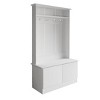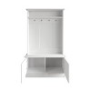 Transform your entryway with our stylish and functional multipurpose hall tree. Designed with timeless elegance, it seamlessly complements any decor while offering essential storage solutions. Featuring a double prong hook, it provides ample space to organize coats, hats, towels, and bags, keeping your space tidy and clutter-free. Crafted from solid and engineered wood, it combines durability with a refined aesthetic. The legless, full-floor design enhances stability and makes cleaning effortless. For added convenience, the hall tree includes a built-in bench and two cabinets with doors for additional storage. Available in Dark Grey, Light Grey, Brown, Black, and White, it ships in one box for easy assembly and delivery, making it the perfect balance of functionality and style for your home.