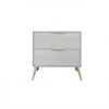 Fancy up your bedroom vibes with with our timeless and versatile nightstand, designed to complement your dream bedroom aesthetic effortlessly. This stunning piece effortlessly harmonizes with your existing bedroom furniture, creating a cohesive and stylish atmosphere. With two spacious drawers, it offers ample storage space for your belongings, helping you keep your bedroom tidy and organized. Crafted from a combination of solid and engineered wood, this nightstand ensures both stability and durability, promising a long-lasting addition to your bedroom. Supported by four sturdy gold metal legs, it not only adds charm but also enhances stability and durability. The modern gold drawer handles serve as a luxurious finishing touch, adding an elegant element to the overall design. Additionally, the top surface of the nightstand provides a convenient space to place essential items like a table lamp and other bedroom necessities. Cleaning and maintenance are a breeze, making this nightstand a practical choice for your bedroom. It ships in one box and comes with clear instructions and a sorting hardware pack, ensuring easy assembly. Available in classic colors – Black, White, Silver, and Grey – you have the freedom to choose the option that best suits your personal style and complements your existing bedroom decor.