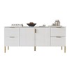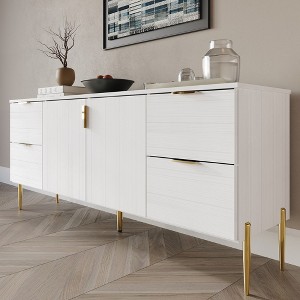 Introducing our luxurious All-in-One Storage Sideboard, designed to elevate your living room with its expansive storage capacity and elegant gold accents. This sideboard features four drawers and two spacious cabinets, each with two levels of storage to keep your belongings organized. Ideal for storing towels, accessories, or daily items, this sideboard offers unmatched functionality. The surface is easy to clean with just a damp cloth, while gold metal handles on the drawers and cabinet doors add a touch of sophistication to your space. The modern and simple styling is complemented by traditional molding on the cabinet tops, all crafted from durable engineered wood with veneer. Supported by four sturdy gold metal legs and an additional center support leg, this sideboard ensures stability and longevity. Available in three classic colors: timeless white, refined dark gray, and contemporary light gray, our All-in-One Storage Sideboard is the perfect blend of style and practicality for any home decor.