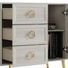 Bring style and practicality to your home with this sleek sideboard cabinet. Featuring two spacious door cabinets and three central drawers, it offers generous storage for all your essentials. The sophisticated gold circle-shaped handles elevate its design, while the sturdy gold metal legs and reinforced center support leg ensure solid support. Crafted from durable solid and engineered wood, this cabinet promises lasting strength. Available in three attractive finishes—Light Grey, Black, and White. Assembly is easy with included instructions, and it ships efficiently in one box. Perfect for a variety of uses in any room.
