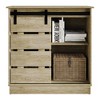 Create a cozy and organized space with this sliding barn-style cabinet, blending farmhouse aesthetics with modern functionality. The paneled doors glide smoothly on durable metal tracks, revealing four roomy shelves and a wide top shelf to keep your belongings neatly stored or beautifully displayed. Crafted from engineered wood with a robust veneer finish, this cabinet is available in stylish Light Grey, Light Oak, and Walnut options. Ideal for entryways, living rooms, or family rooms, it arrives in one box and includes simple assembly instructions. Add rustic charm and practical storage to your home with this standout piece.