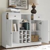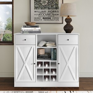 - Includes two drawers, two door cabinets, two open shelves, and a wine rack, providing ample storage for books, wine, and more