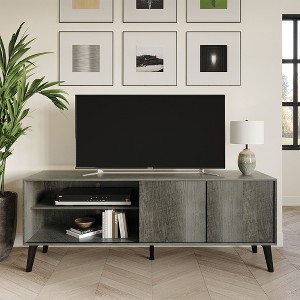 Transform your living room with our stylish TV stand, designed to seamlessly blend into any space. The generous 60-inch top surface offers ample room for your TV and decorative items, while three shelves, two with cable management holes, help keep your wires neatly organized. The sliding doors allow for easy access to stored items, enhancing both convenience and the stand's sleek, modern look. Crafted from a durable combination of solid and engineered wood, this stand is supported by four sturdy legs, plus an additional center support leg, ensuring superior stability. Available in Sanremo Light Oak, Grey, and Brown, it complements a variety of decor styles. Assembly is straightforward with the included instructions, and it conveniently ships in one box, making it an ideal addition to your home entertainment setup.