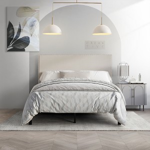 Enhance your bedroom with the timeless elegance of this low-profile upholstered bed, designed to create a spacious and stylish atmosphere. The headboard, wrapped in linen-look fabric, combines classic charm with modern materials, offering a sophisticated touch to your space. Silver-finish chrome nailhead trim lines the edges of the headboard, delivering a striking and glamorous accent. The clean-lined, minimalist design complements various decor styles, while the bed’s low profile enhances the illusion of a larger room. Built with sturdy center legs and wooden slats, this bed frame ensures reliable support for your Twin, Full, Queen, or King size box spring and mattress (not included). Additional storage space beneath the bed skirt helps you keep your bedroom organized and clutter-free. Available in Light Grey, Warm Grey, and Charcoal Grey, this bed frame allows you to select the perfect hue to match your decor. Box spring required. Choose the size and color that best fits your bedroom for a cohesive and polished look.
