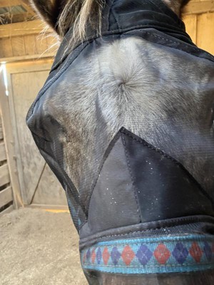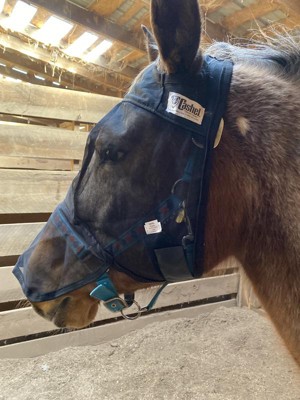 I love how my horse can see clearly through this mask and he looks handsome. The only problem is the long nose band. He gets it filthy, especially when he drinks from his water bucket. Since it’s black it attracts dust and dirt and I have to constantly wash it.