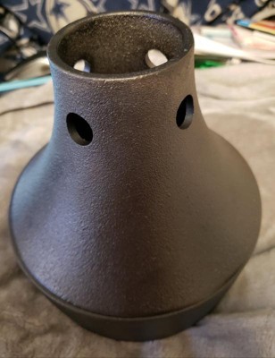 [This review was collected as part of a promotion.] My brother loves to BBQ and he was thrilled to get this Cast Iron Beer Can Roaster. It is made of seasoned cast iron and is heavy and well made. Not very big at about 6" tall and comes in 2 pieces. The bottom bowl will hold seasoning, garlic or the juices from your cooking chicken with beer. Also use to do vegetables or small pieces of meat on the grill. The top attaches easily and you place your chicken over the small opening in the chicken's cavity. Comes with a recipe right on the box explaining how to prepare it. Also includes instructions on how to cure the cast iron. Can be used on the grill or also in the oven. He was excited about it and recommends it.
