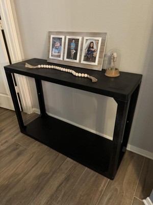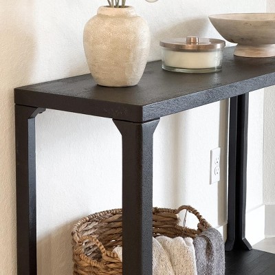 Upgrade your home decor with the functional style of this Castalia Console Table from Threshold™. This rectangular console table features a spacious tabletop to showcase framed photos, potted plants and more, while a built-in bottom shelf offers extra storage. The table is crafted with a wooden frame in a solid black finish for a stylish look that will integrate well into any existing decor scheme.