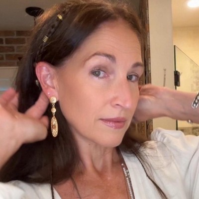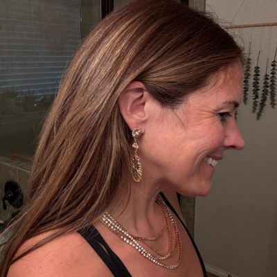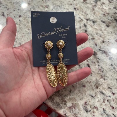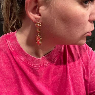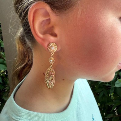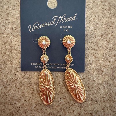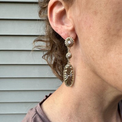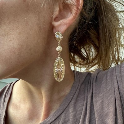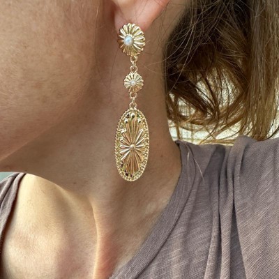 A: The earrings have a casted triple floral drop design with white faux-pearl accents and gold-tone beaded details.
