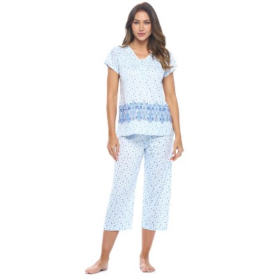 Size recommendation: Size Medium (4-6) Large (8-10) X-Large (12-14) XX-Large (16-18), Order one size up For a more Relaxed Fit Hit the sack in total comfort with these Soft and lightweight Cotton Blend Pajamas in a fun spring patterns Capri Length Pants with an elastic drawstring waist for easy pull on, pant inseam length approximately 21, Shirt Features: Short Sleeves, Notch collar, handy patch pocket, Button down closure, lace and ribbon details for the extra feminine touch. A comfortable relaxed fit perfect for sleeping or lounging around.