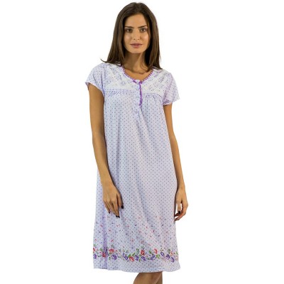 Size recommendation: Size Medium (4-6) Large (8-10) X-Large (12-14) XX-Large (16-18), Order one size up For a more Relaxed Fit Hit the sack in total comfort with this Soft and lightweight Knit Nightgown in a fun floral pattern. Nightshirt features: 5 Button closure, square neck, short sleeves, detailed with lace and Smocking for an extra feminine touch. Approximately 40 from shoulder to hem. A comfortable fit perfect for sleeping or lounging around.
