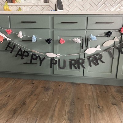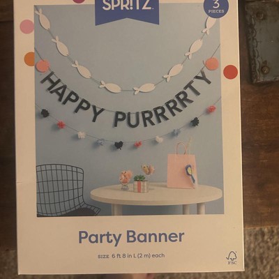A: The banner features a cheerful 'Happy Purrrrty' design, perfect for cat birthday celebrations.