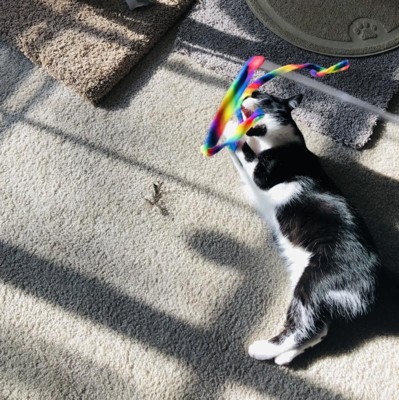 Size: 1 Rainbow. Cat Charmer is an interactive cat toy designed to charm and not harm. With a polycarbonate wand and very colorful fabric Cat Charmer provides excellent aerobic exercise and is a safe interactive toy for all kittens cats and kids. Now with bright new candy colored wands and a fun selection of colors.