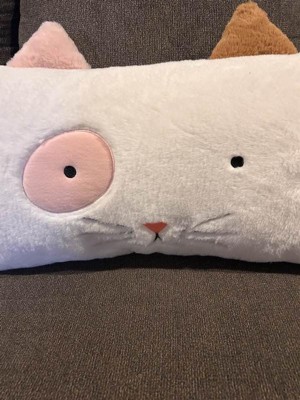 This pillow is so cute! We're cat people, and this pillow is a fun decorative element to add to our living room. It's a nice size to lean back against. The covering is also really soft and feels great to the touch.