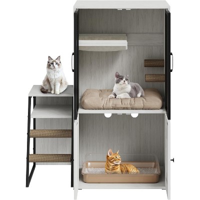Cat Litter Box Enclosure with Platform, Modern Wooden Litter Box Cabinet with Ramp, Double Layer Hidden Litter Box, Villa Cat House with Ladder