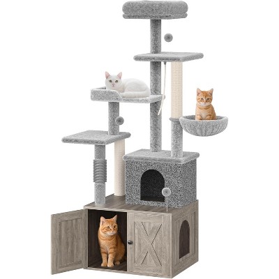 Cat Tree with Litter Box Enclosure, Hidden Cat Washroom Furniture, All-in-One Indoor Kitten House w/Scratching Posts, Cat Tower, Hammock, Gray