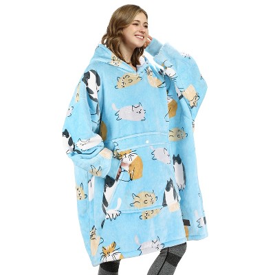 [This review was collected as part of a promotion.] My daughter became so excited when we had her open the package containing the wearable blanket. We ordered the blanket in the blue cat pattern. Our daughter really loves it, saying that it is, “So soft!” It is very soft on the inside and the outside. It is absolutely huge and way too big on her. It actually fits me and it fits my husband. My daughter still loves wearing it and using it like a regular blanket. It has a nice, large pocket with a snap on the top and openings on the sides.