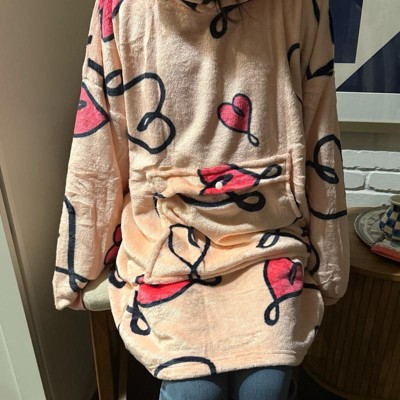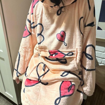 [This review was collected as part of a promotion.] This is a very cute fuzzy home, oversized sweatshirt. I love the heart design and the different shades of pink. It is long enough to come to my knees and I am 5’3”. The fabric is so soft it is not heavy, so you are not adding a lot of weight to yourself which keeps it from being stressful. It’s great to for when you’re sitting and watching movies or a football game. Great for the winter time.