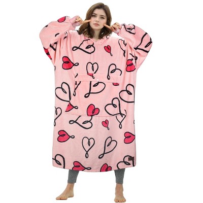 [This review was collected as part of a promotion.] This is a very cute fuzzy home, oversized sweatshirt. I love the heart design and the different shades of pink. It is long enough to come to my knees and I am 5’3”. The fabric is so soft it is not heavy, so you are not adding a lot of weight to yourself which keeps it from being stressful. It’s great to for when you’re sitting and watching movies or a football game. Great for the winter time.