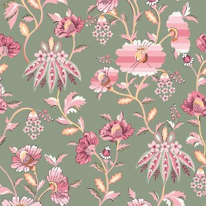 A full roll of this product is 20.5 inches wide and 396 inches long. A full roll can cover up to 56 square feet depending on the design match and pattern repeat. A sample of this product is 8 inches by 11 inches. Enter a world of botanical bliss with Friendship Garden Sage. This matte finish wallpaper is intriguingly enchanting with its whimsical jacobean inspired floral design in an array of pink and white tones, accented by subtle pops of yellow, all laid upon a khaki green background. Straight match with a 24.8 inch pattern repeat