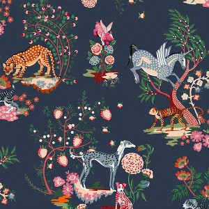 A full roll of this product is 20.5 inches wide and 396 inches long. A full roll can cover up to 56 square feet depending on the design match and pattern repeat. A sample of this product is 8 inches by 11 inches. Make fanstasy into a reality with Painted Kingdom Navy, bringing to life a world of creativity and imagination. Featuring an array of hand painted style animals from tigers and monkeys, to mythical creatures such as unicorns, flying pigs and blue and red dogs. All displayed within multi-coloured spherical designs, encapsulated by whimical trees, plants and florals, adding awe and wonder to this uniquely beautiful design. All laid upon a deep navy blue backdrop, completed with a matte finish for that modern look and feel. Offset match with a 21.8 inch pattern repeat