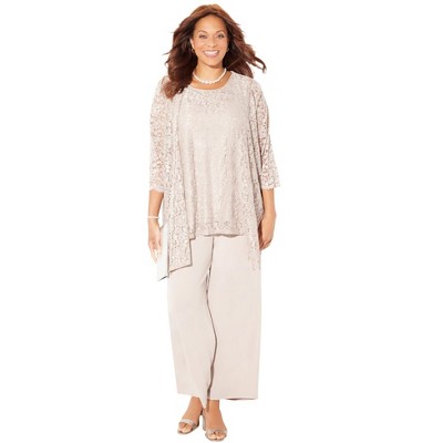 Catherines Shiny Pleated Knit 3-Piece Pant Suit - 32 W, Mocha