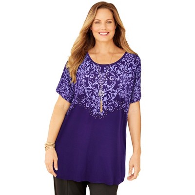 Catherines Black Label Faux Leather Trim Tank - 3X, Purple Damask
