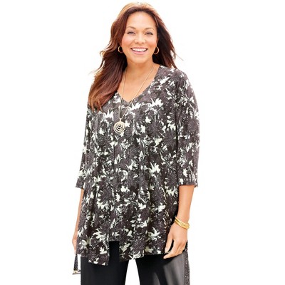 This comfy notch-neck tunic gets a golden dose of attitude from bold grommets and a removable lace-up chain detail. With breezy side slits and effortless 3/4 length sleeves, this tunic blouse pairs perfectly with sleek leggings or your favorite denim for a look that oozes comfort and style. Style it with or without the chain for versatility..